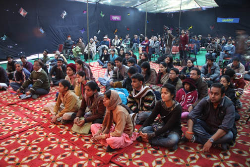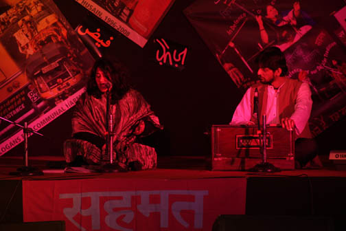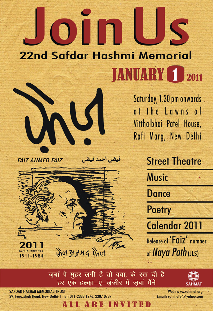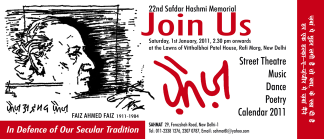 Raat yun dil mein teri khoee hui yaad aai Jaise veerane mein chupke se bahaar aa jaye, Jaise sehraon mein haule se chale baad-e-naseem, Jaise beemar ko be-wajh qaraar aa jaye. JANUARY 1, 2011: The beginning of the New Year bringing to us the memory of our beloved Safdar --- a poet, theatre worker, an exemplary political activist. Asking us to renew our pledge of creativity. The day of warmth and love again saw a gathering of poetry, music and dance. This year, the audience on the occasion also remembered their unparalleled bard of revolution, Faiz Ahmed Faiz, with a new hope and outspokenness --- singing him, feeling proud of his legacy. We are now in the birth centenary year of Faiz Ahmed Faiz, a great progressive poet of Asia, nay of the world, who was born in Sialkot (now in Pakistan) in the year 1911. A favourite poet of martyr Safdar Hashmi, and of all of us. The New Year this time was thus a very special occasion. The Safdar Hashmi Memorial Trust (SAHMAT) has decided to observe the whole Faiz Centenary Year in a special way and began the process on the New Year itself. The day, thus, turned to be a memorable one. People, one and all, were invited this year too, like the years gone by, to this Jashn-e-Yaaran, and much before the scheduled time they began to throng the huge people’s pandal, a covered big tent, put up in the lawns of Vithalbhai Patel House in New Delhi. Full of vigour and enthusiasm, a play by Act One as if came to us as a revolutionary song. Like the earlier years, a street theatre troupe coming from Rohtak was permeated with the same emotions. Manu Kohli regaled the audience with Faiz’s ghazals and nazms. Next, Dr Anju Raina took to the stage and, in her heart-moving voice, presented “Dasht-e-tenhai mein ai jaan-jehan larzan hai,” a moving piece of romantic poetry by Faiz Ahmed Faiz. The following stanza of the poem Is qadar pyaar se ai jaan-e-jehan rakkha hai Dil ke rukhsar pe is waqt teri yaad ne haath Yun guman hota hai, garche hai abhi subh-e-firaaq Dhal gaya hije ka din, aa bhi gayee qasl ki raat intensely brought to the audience the fond memories of Faiz as well as Safdar, and thus set in motion the caravan of colour and music. The audience felt spellbound as soon as Astad Deboo, an Indian dancer of international renown, came to the stage. The music descending down into the souls and the dance presentation by Astad Deboo --- time was moving moment by moment, giving new dimensions to Faiz’s poetry. The atmosphere was getting surcharged with emotions. As soon as Astad concluded the ‘bol’ of his dance, the temperature inside began to rise even though the polythene-made roof of the tent was getting affected by chilly winds. Maybe it was something like what Ghalib had called “raqs-e-sharar”(the dance of sparks). Modern art experiments in the East have received their sheen from the struggle for independence, and revolutionary poets like Faiz have played a notable role in this process. It would not be out of place if we situate the dance experiments by Astad Deboo in this very tradition. Sentiments further deepened when the high-pitch voice of Rekha Raj began to call the years gone by, through her rendering of the poetic creations by Faiz Ahmed Faiz. Rekha received her training from her maternal grandmother, Khursheed Begum of Sheikhupura (Pakistan), and from Vasant Lal Ji of Rajasthan (India). She presented the well known poem “Mujh se pehli si muhabbat meri mehboob na maang” and some other pieces including“Rabba Sacchya,” a Punjabi poem by Faiz Ahmed Faiz. The offspring of a Muslim mother and a Hindu father, Rekha presents an image of the Ganga-Jamni (syncretic) culture of this country. However, |